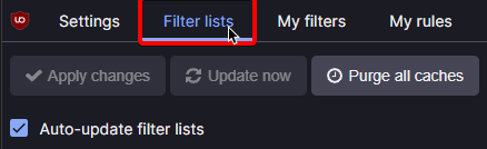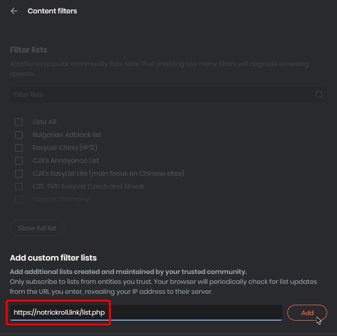 Then scroll to "Add custom filter lists" and paste the link of our list: