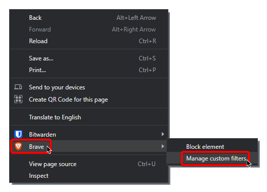 Right-click on any part of the page and click on "Brave", next click on "Manage Custom Filters".